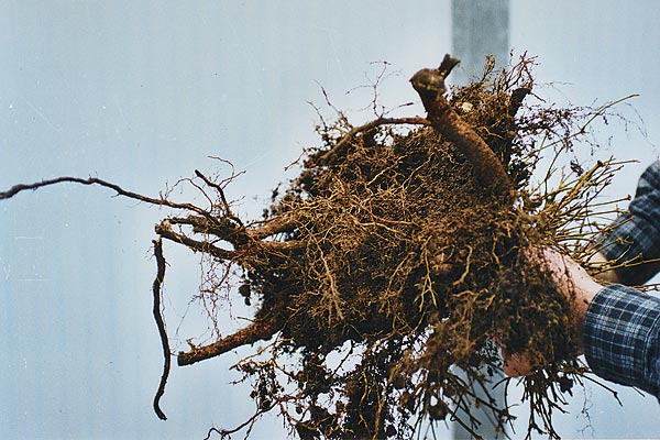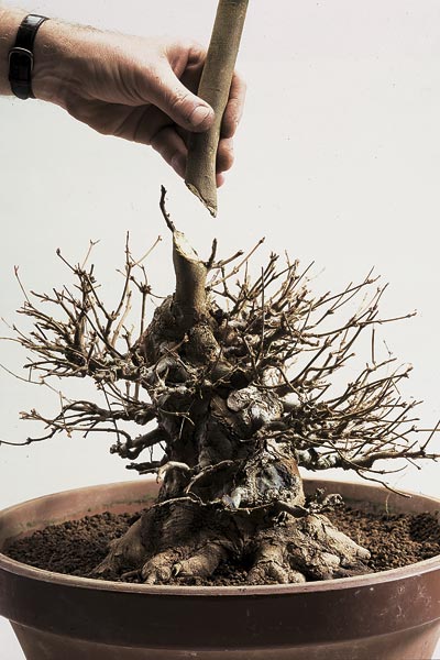 Vor dem Einpflanzen in den üppig dimensionierten Trainingstopf beschnitt ich die kräftig ausgebildeten Wurzeln, um das feine Wachstum zu kontrollieren (Foto). Ebenso beschnitt ich den langen Trieb ca. 3 cm oberhalb der ersten Schnittstelle, um in der Zukunft eine schöne Verjüngung sowie eine möglichst naturnahe Bewegung zu gewährleisten (Foto). Sowohl im Freiland als auch im Trainingstopf behielt ich, soweit möglich, durch Pinzieren und Schneiden eine möglichst feine Aststruktur bei. Nur an der Stammverlängerung wünschte ich starkes Wachstum.