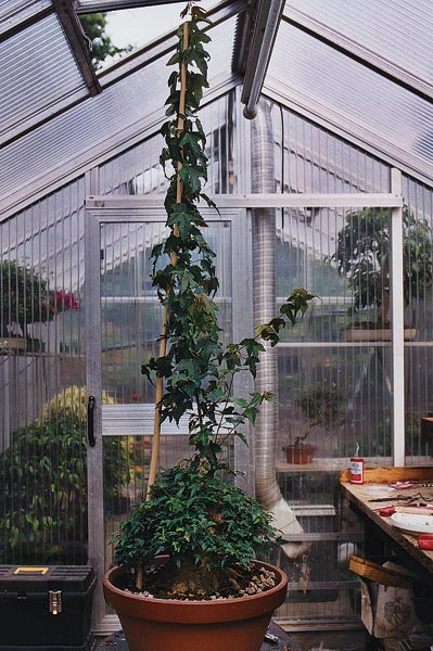Nach einem Rückschnitt bis in das lebende Holz hinein pflanzte ich den Baum ins Freiland, um optimale Wuchsbedingungen zu schaffen. Nach der relativ geringen Zeit von 2 Jahren mit stickstoffbetonter Düngung hatte sich ein 2,80 m hoher neuer Trieb entwickelt, der auch die nötige Stärke aufwies, um den Baum weiter zu gestalten (Foto).