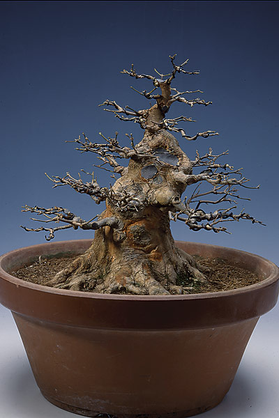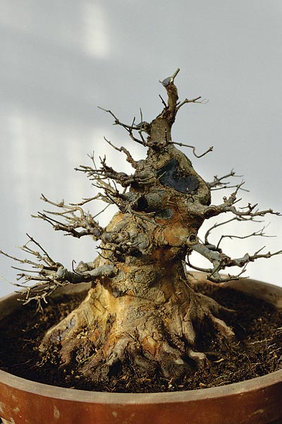 Im Frühjahr 2004 pflanzte ich den Baum in eine passende Schale (Foto). Rechtzeitiges Pinzieren und Schneiden verfeinern die Aststruktur, halten den Baum in Form und werden für gutes Wachstum sorgen, so das die beiden großen Schnittstellen in 4 – 5 Jahren überwuchert sein werden.